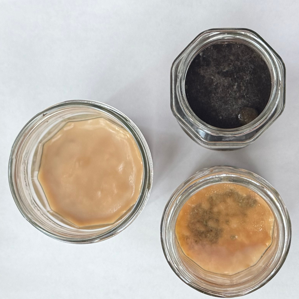 If you ever see fuzzy black, gray, blue, green or white spots forming on the top of the pellicle or on the jar- that is mold. If you have mold, you need to trash that entire batch. Mold spores spread throughout the liquid, and it will be unsafe to consume. Bottom of Form